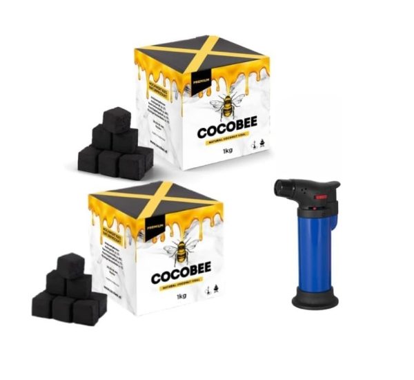 Pack de 2 COCOBEE Carbón de Cáscara de Coco Natural, Cubos con Sabor a Coco, Cocina, Hogar, Cachimba, BBQ y Shisha + 1 Soplete de Regalo