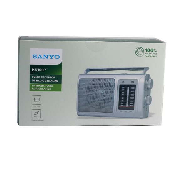 Presenta Radio Sanyo KS109P Radio Analógica Sobremesa Am/FM Red y Pilas. Color Plata