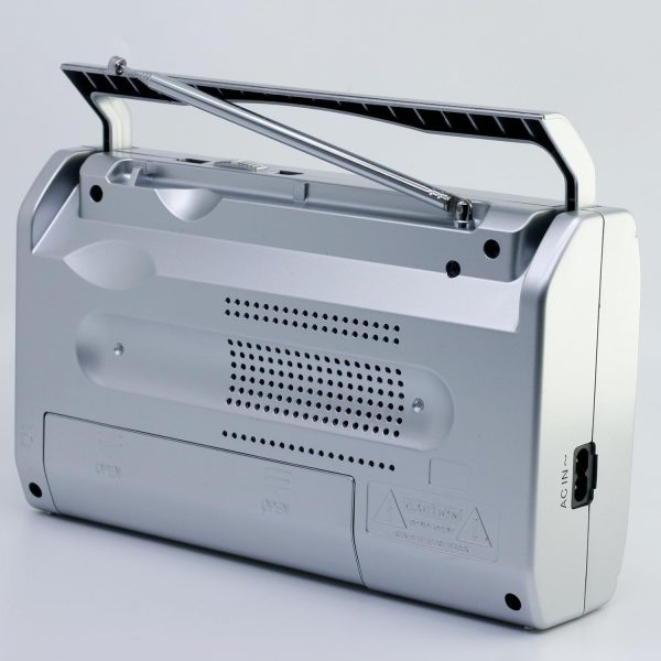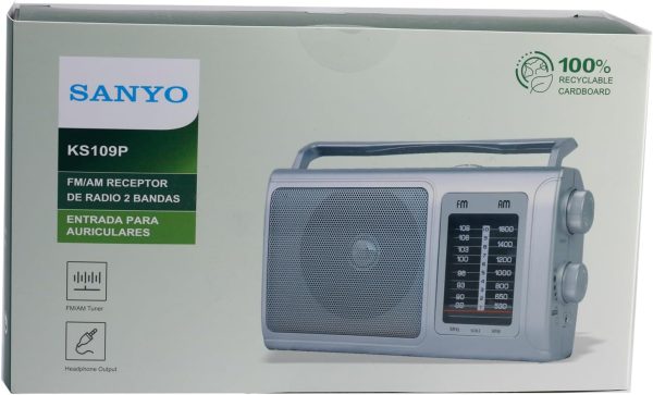 Presenta Radio Sanyo KS109P Radio Analógica Sobremesa Am/FM Red y Pilas. Color Plata